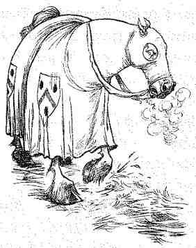 Сказал я и вдруг почувствовал чье-то горячее дыхание; обернулся и увидел своего коня — у него изо рта, обдувая мне шею, шел пар. И был он в черной попоне с серебряной прошвой. Я сразу узнал эту вещь. Без сомнения, это попона жеребца Богатенького Мальчика. Может быть, Джед чувствовал, что его укутали попоной с мертвого коня, или же его беспокоил шум, доносившийся снаружи, но, как бы то ни было, вел он себя необычно. Он бил копытами, вращал глазами и, закусив удила, скрежетал железом.