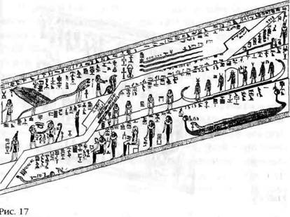 Спускаясь ниже, фараон минует дверь и оказывается на третьем, самом нижнем уровне. Он входит в прихожую с эмблемой Небесного Диска, и там его приветствует бог, «Вестник Небес», и богиня с эмблемой Шу, «Того, кто пребывает на небесах на Лестнице в Небо» (рис. 18). Фараон просит разрешения у «двух детей Шу» проследовать путем Осириса и подняться в небо.