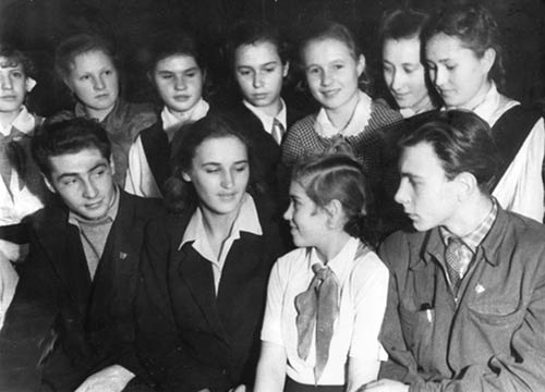 Нонна Мордюкова и Вячеслав Тихонов на встрече с пионерами. 1949 г.