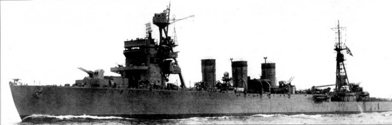 Модернизированный крейсер «Исудзу» на ходовых испытаниях в Токийском заливе, 14 сентября 1944 г. Корабль переоборудован в крейсер ПВО. В таком виде «Исузу» стал флагманским кораблем 31-й эскадры, которая обеспечивала противолодочную оборону японского флота. На крыше носовой надстройки смонтирована антенна радиолокатора обзора воздушного пространства. Главный калибр крейсера после модернизации составляли универсальные орудия калибра 127 мм. Вместо старых 530-мм двухтрубных торпедных аппаратов установлены новейшие четырехтрубные торпедные аппараты калибра 610 мм.
