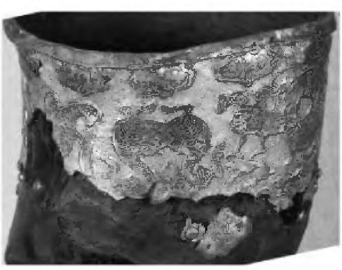 Редкие на Руси изобразительные мотивы — зооморфные, в том числе скандинавский звериный стиль, «хватающий зверь» и т. п. и антропоморфные амулеты в виде «валькирий», мотивы человека между двух птиц[199] или животных обычно включены в орнаментальные композиции. Древнейший в русском искусстве сюжет усматривается в изображениях на оковке большого питьевого рога из жертвенного комплекса кургана Черная могила. Серебряные оковки малого ритона выполнены в технике чеканки, золочения, растительный орнамент — золоченые переплетенные пальметты на серебряном фоне — близок венгерскому декоративному стилю X в. (рис. 48). На большом ритоне в технике чеканки, золочения, чернения передана многофигурная композиция, центр которой представляет грифон, развернутый по геральдической схеме двуглавого орла (с пальметтой в середине; сходный мотив имеется на зерненой подвеске из гнёздовского клада и др.) и другие парные мотивы: два лучника меж двух птиц, два терзающих друг друга чудовища с хвостами, сросшимися в пальметту (рис. 49).
