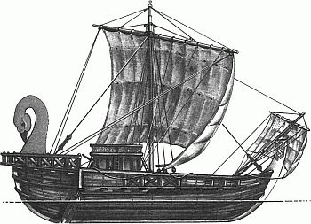 На его корме художник пририсовал какую-то надувную лебединую шею. В других случаях иногда пририсовывают кирпичные башни, стоящие посередине палубы. Делают это художники, без сомнений, для того, чтобы хоть чем-то отличить «древнеримские» суда от средневековых, от которых они на самом деле отличаются только отсутствием «наваррского» руля. В Европе такие суда могли использовать еще в XIII веке, наряду с судами, уже получившими новый руль.