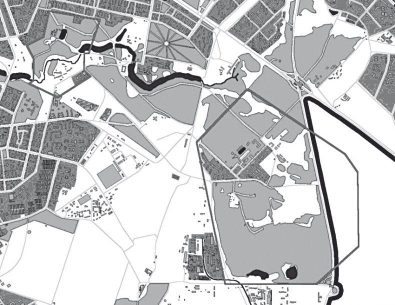 Военно-химический полигон в Кузьминках (на карте нынешней Москвы). Выделены два участка полигона: слева — жилой (ныне — Парк культуры и отдыха «Кузьминки»), справа — испытательный (ныне — лесопарк «Кузьминки»). Между ними расположена усадьба С.М. Голицына.