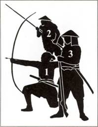Пешие воины облачены в очень простые доспехи, состоящие из металлических пластин, соединенных кольчужкой на матерчатой основе; единственной защитой головы служит металлическая пластина, пришитая к хатимаки. Одеты они по-летнему. На знамени слева начертан иероглиф «рё» (дракон), а на знамени справа — «би», первый иероглиф имени Биса-мон-тэн, одного из трех японских богов войны.