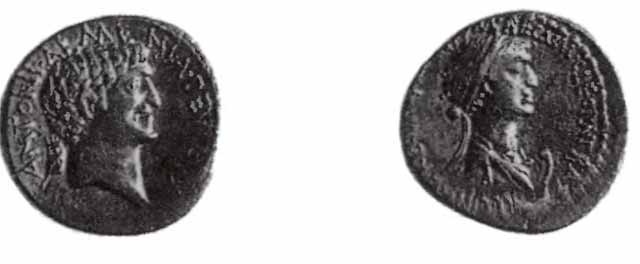Аверс: профили Клеопатры VII и Антония. Реверс: богиня Тюхе как персонификация города.
