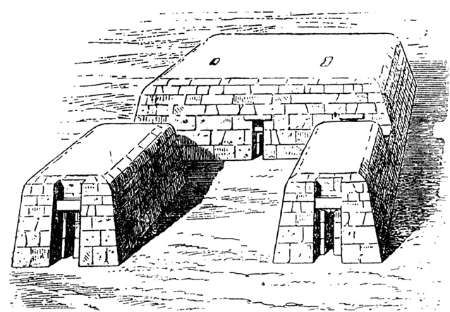 Пирамида – главное достояние строительного искусства рассматриваемого периода. Однако подобное явление в архитектуре не могло появиться на пустом месте. История возникновения этой точной законченной формы довольно длительная. Форма предельно проста, но на ее поиски ушли столетия. Свое развитие форма ведет, с одной стороны, от древнего дольмена как курганного погребения. Ведь пирамида – это усыпальница фараона и предназначена сохранить его останки в виде мумии на века. Протяженные галереи, ведущие в погребальные камеры, хорошо видны на разрезе пирамиды Хеопса (см. вкл., рис. 22). Следовательно, пирамида – погребальный холм, только не бесформенный, созданный из земли и камней, а строго геометризованный, сложенный из точно подогнанных каменных элементов. С другой стороны, направление развития этой формы кроется в жилом доме. Собственно, сам дольмен корнями также восходит к жилому дому. Именно так трактовалась могила усопшего. Ему создавались все условия «жизни» в загробном мире, как на земле. А вот промежуточным звеном между дольменом и пирамидой стало погребальное сооружение для усопших представителей аристократической верхушки египетского общества – мастаба (рис. 4.1). Мастаба имела форму усеченной пирамиды, несколько вытянутой в длину или ширину, с проемом, имитирующим входной проем в жилой дом. Она явилась основой для последующего возникновения пирамиды. Однако до конечного результата было еще далеко. Мастаба строилась уже в эпоху Раннего архаического царства. В III тыс. до н. э., в эпоху фараона Джосера (около 2770 г. до н. э.), строятся ступенчатые пирамиды, например такие, как пирамида Джосера в Саккара (вкл., рис. 25). Можно предположить, что такая пирамида создавалась по принципу надстройки каждого нижнего уровня одной или двумя мастабами каждого последующего уровня. Идея пирамидальности формировалась сама собой. Однако дробность композиции, с одной стороны, позволяет ей лучше слиться с окружающим морем песка, с другой – не создает той целостности впечатления, к которому стремится архитектор в дальнейшем. Следующая ступень развития – двухступенчатая пирамида в Медуме (вкл., рис. 26). В ней ступени объединены, их осталось только две. Чувствуются упрощение формы и придание ей большей целостности, тем более что нижняя ступень очень массивная по сравнению с верхней, которая только дополняет общую композицию. Грани стали абсолютно гладкими, что приближает это композиционное решение к еще более законченной, геометрически правильной пирамиде. В пирамиде в Дахшуре осталось изменить совсем немного – выправить излом грани (вкл., рис. 27). И наконец, возникает комплекс в Гизе (см. вкл., рис. 17), и строится еще множество пирамид со строго геометричной формой вдоль по Нилу.