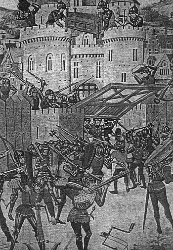 «Возвратимся, однако, к городам и крепостям. Для лучшей защиты ворот, а также для облегчения вылазок и обратного вступления войск в крепость французы пользуются еще одним способом, который в Италии, по-моему, еще никогда не применялся: у конца подъемного моста ставятся два столба; посередине каждого из них укреплена подвижная балка, половина которой висит над мостом, а другая половина остается за ним; наружные части подвижных балок соединены мелкими брусьями, образующими решетку, а с внутренней их стороны прикрепляются цепи. Чтобы закрыть мост снаружи, спускают цепь и сбрасывают решетку, которая при падении загораживает вход; наоборот, когда надо открыть мост, цепи подтягивают, поднимают решетку, насколько нужно, чтобы пропустить пехотинца или всадника, а затем сейчас же закрывают ее снова, ибо решетка поднимается и опускается подобно заслонам бойницы.