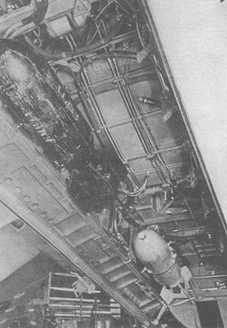Эксперименты по подвеске в бомбоотсек Эвенджера макета 1000 фунтовой (554 кг) бомбы. Видны специальные бомбовые замки, сконструированные фирмой Грумман специально для подвески этих бомб.