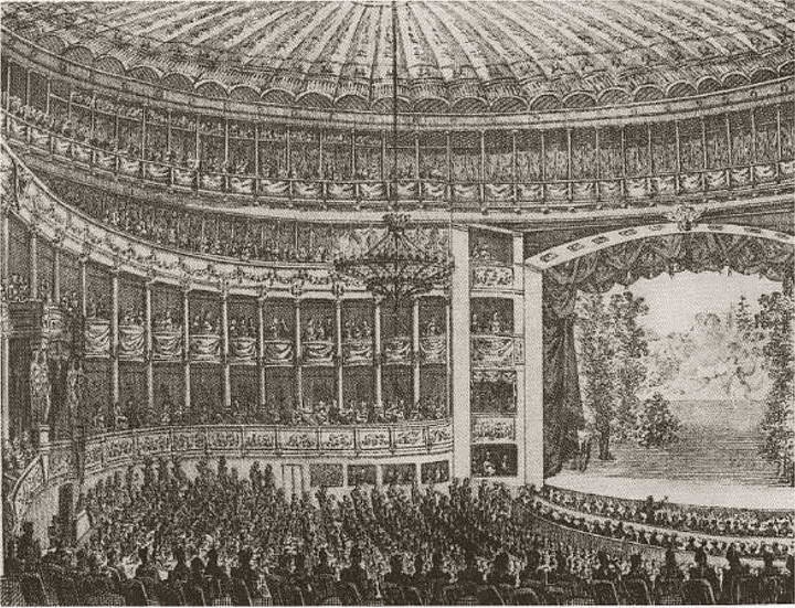 Зрительный зал петербургского Большого театра. Гравюра С.Ф. Галактионова по рисунку П.П. Свиньина. 1820-е гг,
