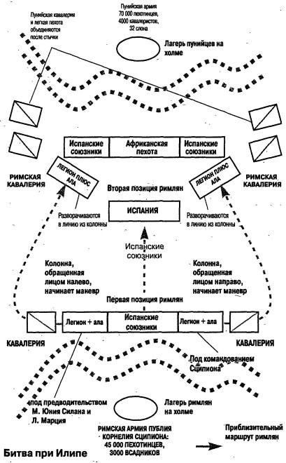 Кавалерия и легкая пехота карфагенян первыми завязали с римскими всадниками и пехотинцами бой, исход которого был пока неясным. Следом выступила главная армия пунийцев, она развернулась в линию у края равнины перед холмом, на котором был разбит их лагерь. Солдаты Сципиона находились теперь гораздо ближе. С этого расстояния Гасдрубал наконец смог увидеть, что легионы стояли не на своем обычном месте в центре, а на флангах, напротив его более слабых войск. Это означало, что его лучшие пехотинцы противостояли испанским союзникам римлян, что, возможно, было некоторым утешением, ибо, если дело дойдет до лобового столкновения, его ливийцы должны разбить этих плохо подготовленных и легко вооруженных бойцов. Возможно, такая перемена привела пунийского полководца в некоторое замешательство, но трудно сказать, знал ли об этом Сципион. В любом случае Гасдрубал сейчас не имел возможности перестроить свои войска, чтобы приспособиться к изменившейся расстановке сил противника. Если бы он попытался перераспределить своих бойцов в центре, это только бы посеяло панику, и неприятель, полностью готовый к бою, предпринял бы немедленную атаку.