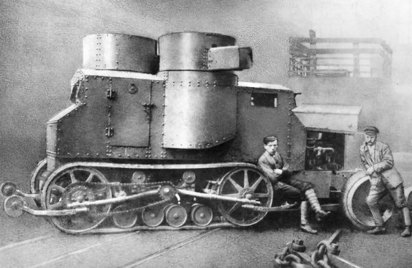Бронеавтомобиль «Остин» русской бронировки с приспособлением Кегресса в цеху Ижорского завода. 1919 год. Конструкция приспособления отличается от первого образца, установленного на броневике «Остин» 2-й серии (АСКМ).