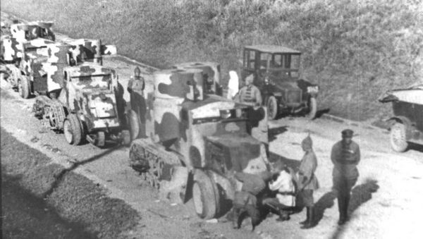 Учения войск Московского военного округа, предположительно 1921 год. На фото бронеавтомобиль «Остин-Кегресс» из состава 2-го автоброневого отряда Красной Армии. На бронелисте перед радиатором видна красная звезда и надпись «2 АБО», на борту красная звезда, название машины «Стенька Разин» и надпись «РСФСР» (РГАКФД).