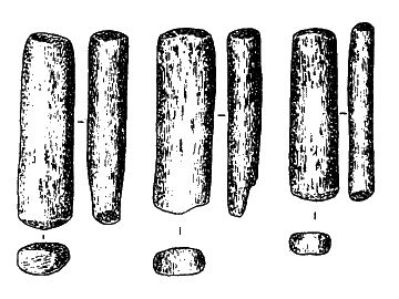 Пе менее интересными оказались и три костяные палочки, входившие в комплект «плотницы» с охотничьим наборным ножом. Все они однотипные, вытянутой прямоугольной формы со слегка округленными боковыми гранями, прямоугольноовальные в сечении. Изготовлены были из поперечно распиленных мелких рогов косули. На их внешней поверхности местами сохранились следы полихромной росписи — окраски красной и черной охрой. Изучение показало, что перед этим они были аккуратно обточены со всех сторон на абразиве, а потом заполированы. Последнее доказывает, что они представляли собой не орудия труда или украшения, а, скорее всего, служили определенным культовым целям. Возможно, с их помощью гадали или даже играли в древности.