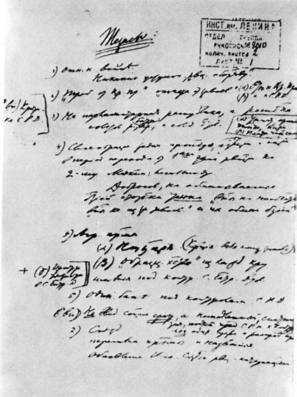 Рукопись В. И. Ленина. Первоначальный набросок «Апрельских тезисов» 3 (16) апреля 1917 г.