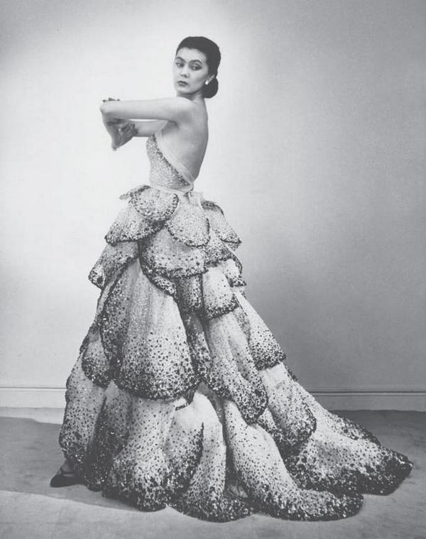 Русская маникенщица Алла Ильчун в вечернем платье «Юнона» из тюля, вышитого блестками, от Диора, коллекция осень-зима 1948/1949