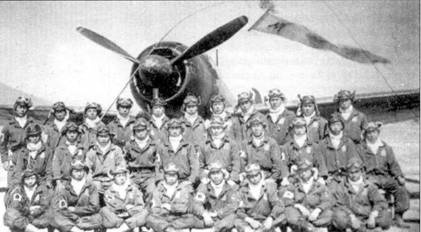 Групповой снимок летчиков 303-й эскадрильи 203-й авиагруппы, июль 1945 г. 203-я авиагруппа пережила не одну реорганизацию. В воздушных боях над Филиппинами группа понесла тяжелейшие потери. Наиболее опытным летчиком группы являлся старший петти-офицер Такео Танимицу (второй ряд, пятый слева). Большинство пилотов — зеленые выпускники авиационных школ.