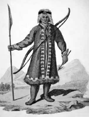 А по той Охоте реки соболя и всякого зверя много и реки рыбные. Они через ту реку на лошадях бродили, и едва лошади в той рыбе перебрели. А река быстрая, и тою быстредью рыбу убивает и на берег выметывает много, и по берегу той рыбы, что дров лежит. А у тех ламутских мужиков по той реки юрты сидячие, как есть большие русские посады. А запасы у них все рыбные, сушеная юкола (вообще юкола — вяленая на солнце или копченая рыба у народов Восточной Сибири) в рыбных мешках и рыбная икра. А того де запасу у них запасают много, что русские хлебные анбары запасы, так у них той пасеной рыбы по юртам много. А ходили де они на ту Охоту реку с Омокона реки и назад шли до Омокона всего пять недель. А бой у них лучной, стрелы-копейца костяные, а бьютца на оленях сидя, что на конях гоняют. И в те поры у них, служилых людей, ранили двух человек».