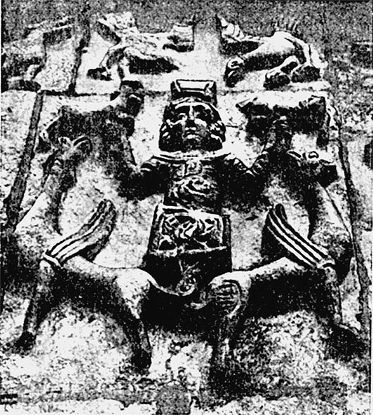Тогда Усень попытался взлететь к трону Всевышнего. Он сотворил престол, к коему привязал могучих орлов, а над ними на копьях повесил мясо, дабы орлы, пытаясь взлететь к пище, подняли также на сём престоле и Усеня.
