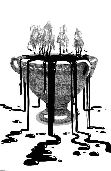 Кошка, чудесный зверь, пробирается по поляне, мягко переступает, скрадывая мышь. К ней бросаются берегини, гонят в дом. Скачет в дверь кошка, распушив хвост, выгибает спину; разъярилась помехе. Как ни проворна, как ни ловка, а, тщательно направляемая берегинями, задевает топор у порога. Упадет топор – отрежет дорогу навьям, обрубит заговор. Вот переворачивается топор на коротком топорище, пугается кошка, прыгает на стол: ведь нет для кошек закона ни в чьем дому, расплескивает воду из чаши, проливая капли цвета крови. Со стола – на лавку, с лавки – на полку в красном углу, где дремлют деревянные деды. Крайний, липовый, в острой шапке, покачивается и летит вниз, на спящих людей. Попадает суковатыми ногами прямо в висок хозяину, тот вскрикивает, не пробуждаясь, но машет рукой, сильно; его тяжелая рука падает на лицо женщины, не дает ей дышать, вытягивает из сна.