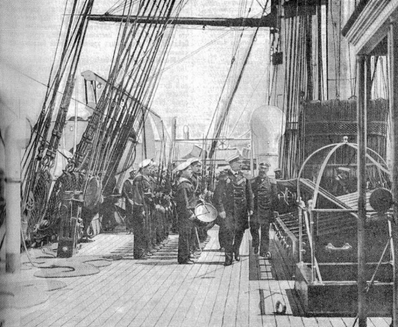 На "Рынде" во время смотра (вверху). Корвет "Рында" на рейде Чифу. Апрель 1895 г. (внизу)
