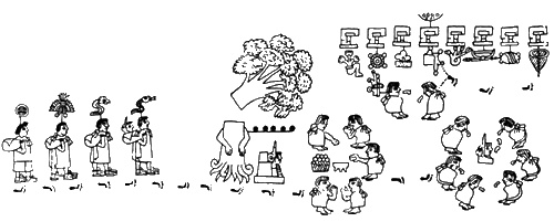 Верхний рисунок правой части фрагмента изображает момент, когда ацтекский вождь (слева) сообщает это приказание бога одному из преподавателей восьми племен (в данном случае это вождь народа, известного как куитлауака); последний огорчен настолько, что плачет.