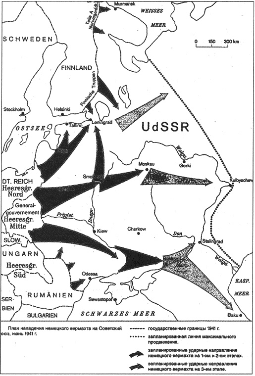 К концу февраля и берлинская агентура ГРУ смогла подтвердить, что удар действительно будет нанесен по трем направлениям: Ленинград (Санкт-Петербург), Москва и Киев — из сообщения Альты от 28 февраля 1941 года: «Сформированы три группы армий… Группа армий “Кенигсберг” должна наступать в направлении Петербург, группа армий “Варшава” — в направлении Москва, группа армий “Познань” — в направлении Киев»{223}. Опираясь на эти и другие аналогичные данные, под руководством резидента ГРУ генерал-майора Туликова берлинская резидентура ГРУ агентурно-аналитическим путем вскрыла принципиальную схему одновременного нанесения нескольких ударов и показала их на специальной схеме.