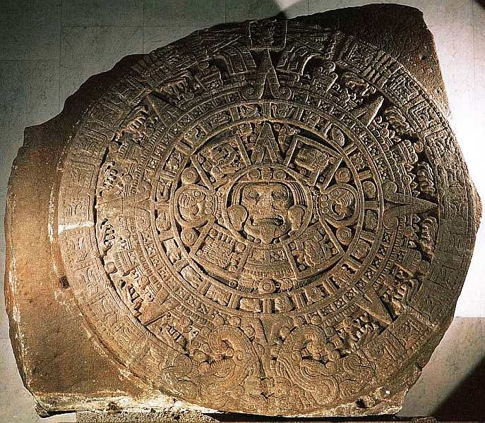 Этот всемирно известный памятник, найденный в 1790 при проведении работ по благоустройству Мехико, стал одним из символов ацтекской культуры. Лицевая сторона каменного блока покрыта сложным рельефом, отражающим космологические представления и концепцию времени жителей Теночтитлана. Календарная символика Камня Солнца дала основание для другого его названия — Ацтекский календарь. Внешнюю окружность диска из базальтовой лавы образуют стилизованные изображения двух огненных змей Шиукоатлей, обозначающих путь светила по небу в дневное время и под землей — ночью. Внутренний круг содержит знаки двадцати дней ацтекского календаря. Традиционно считается, что изображенный в центре лик — бог Тонатиу, почитавшийся божеством солнца текущей эры Науи Олин. Однако, по мнению некоторых специалистов, более вероятна трактовка рельефа как олицетворения божества ночного солнца, связанного с образами земли и смерти. Высунутый язык бога по форме напоминает ритуальный нож, использовавшийся жрецами во время жертвоприношений, а слева и справа лапы ягуара сжимают жертвенные сердца, необходимые для поддержания жизни и движения светила. Намек на пищу солнечного бога неслучаен, ритуальное предназначение камня определяется как алтарь — темалакатль, на нем проливалась кровь пленников, захваченных во время «войны цветов». Вокруг лика божества крестообразно расположены четыре квадрата с символическими знаками четырех предшествующих солнц — космических эпох.