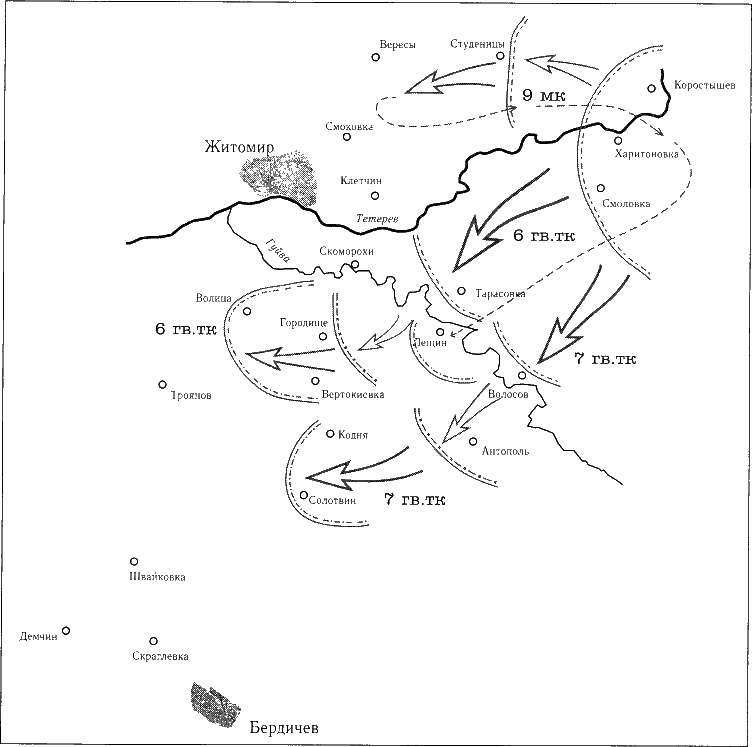 31 декабря 1943 г. войска 1-го Украинского фронта освободили Житомир. В числе частей и соединений, отличившихся при освобождении Житомира, в приказе № 53 Верховного Главнокомандующего от 1 января 1944 г. были упомянуты 9-й мехкорпус, получивший почетное наименование «Житомирский», 7-й гвардейский танковый корпус и 22-я гвардейская мотострелковая бригада, 51-я, 52-я и 53-я гвардейские танковые бригады 6-го мехкорпуса, представленные к награждению орденами Красного Знамени.