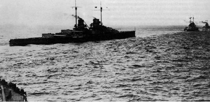 Согласно Вильсону [10]: "Около 19 ч. 25 м. строй из 24 линейных кораблей Гранд-Флита представлял собой перевернутое "L". Ход был уменьшен до 14 узлов, корабли местами скучились, но это не было заметно на германских кораблях, и несколько британских кораблей стреляли не без успеха. Германские артиллеристы не видели никаких целей, кроме блеска орудийных выстрелов, опоясывавших всю северную половину горизонта от востока до запада.