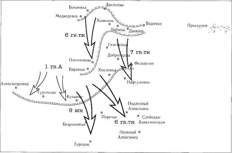 — 9-му мехкорпусу овладеть районом Городок и перейти к обороне на рубеже Городок, Черниводы с целью не допустить удара противника с юго-запада и юга, по выходе стрелковых частей 1-й гвардейской армии в район Городок направить в Ярмолинцы одну мехбригаду для дальнейших действий в направлении на Проскуров;