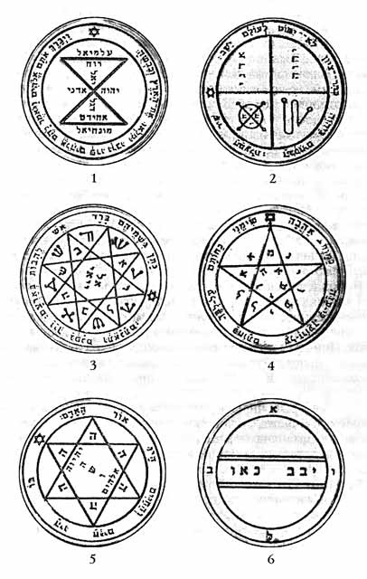 Магические печати Соломона: 1 — печать сватовства и семейной гармонии; 2 — печать от сглаза; 3 — печать защиты (от всевозможных опасностей); 4 — печать исполнения сокровенных желаний; 5 — печать сохранения здоровья; 6 — печать исцеления от бесплодия, плодородия и исполнения заветных желаний.