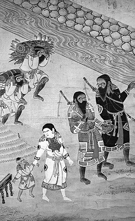 Кто были обитавшие в то время в Японии аборигены? Ученые считают, что это были так называемые айны, или эмиси, самоназвание которых «айну» переводится с их языка как «человек» или «мужчина». Происхождение этого народа остается неясным. Их часто относят к австралоидной расе, однако последние исследования дают возможность предположить их близкие расовые связи с тунгусами, алтайцами и другими жителями Урала и Сибири. Впрочем, сами айны тоже были пришельцами, появившимися в Японии около 8–7 тысяч лет назад, и это они как раз и создали там неолитическую культуру Дзёмон. Внешне эти черноволосые и густобородые «дикари» очень сильно отличались от японцев и говорили на своем языке. Главным божеством у айнов был медведь, на которого они же и охотились. Естественно, что с пришедшими с материка переселенцами имели место и смешанные браки, чем объясняется относительная волосатость японцев по сравнению с другими монголоидами, однако полного смешения аборигенов с ними так и не произошло, а дружественные отношения между ними так и не сложились. Айны пытались уничтожить пришельцев, а те, в свою очередь, уничтожали айнов.