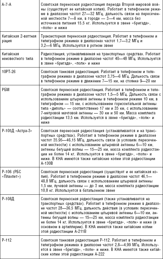 Примечание. В ВВС КНА остается незначительное количество устаревших легких военно-транспортных самолетов Ли-2, тактико-технические данные которых приведены в таблице 4 (см. главу 7) – скорее всего, они уже не эксплуатируются, хотя и наблюдаются на космических фотоснимках. Длительное время на вооружении ВВС КНА состояли также легкие поршневые одномоторные (260 л. с.) четырехместные самолеты связи Як-12 (в модификации Як-12А максимальный взлетный вес 1588 кг, максимальная скорость 215 км/ч, практический потолок 4000 м, максимальная дальность полета 1070 км), легкие поршневые двухмоторные (двигатели по 1850 л. с.) военно-транспортные самолеты Ил-12 (экипаж 4 – 5 чел., максимальный взлетный вес 17 500 кг, максимальная скорость 398 – 407 км/ч, практический потолок 6500 м, максимальная дальность полета 3230 – 3300 км, нагрузка в десантно-транспортном варианте Ил-12Д 37 – 38 парашютистов-десантников или 3700 кг груза, включая легкую боевую технику, вооружение – 12,7-мм пулемет УБ на турели) и легкие поршневые однодвигательные (575 л. с.) четырехместные вертолеты Ми-1 (максимальный взлетный вес 2550 кг, максимальная скорость 170 – 195 км/ч, практический потолок 4000 м, дальность полета 300 – 620 км).