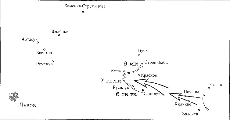 Продолжая наступление, 7-й гвардейский танковый корпус и 9-й мехкорпус вышли к р. Злочувка и, сломив сопротивление «…небольших групп танков (по 4–6 штук на переправе), отдельных орудий и небольших подразделений пехоты противника», захватили переправы у Хилчице и Почапы, переправились на западный берег Злочувки. «Не встречая в дальнейшем организованного сопротивления противника», корпуса первого эшелона продолжали продвигаться вперед. К 9 часам 30 минутам 17 июля передовой отряд 9-го мехкорпуса занял Красное, захватив на станции «…до 150 вагонов, частью с грузами, санитарный поезд и 3 исправных паровоза». 7-й гвардейский танковый корпус к 8 утра передовым отрядом занял Куткож, перерезав железную дорогу Львов—Броды. В районе Русилув части корпуса разгромили штаб 349-й пехотной дивизии и тылы 8-й танковой дивизии. К исходу дня главные силы 9-го мехкорпуса вышли в район Стронибабы, Красное, Куткож, 7-й гвардейский танковый корпус находился в районе Куткож, наступавший во втором эшелоне армии 6-й гвардейский танковый корпус выдвинулся к Русилуву, Скнилуву.
