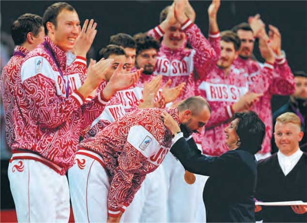 12 августа 2012 года. Награждение сборной России – победителей Игр XXX Олимпиады. Медали вручает олимпийская чемпионка Ирена Шевинъска (Польша)