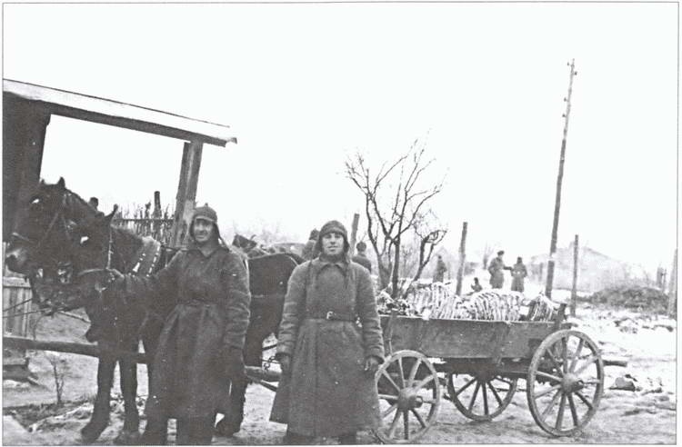 Добровольные помощники немцев (хиви) из числа советских пленных рядом с подводой