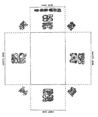 Знак южного направления в письменности майя содержит фонетические элементы, сближающие его по смыслу с понятием «надир». Элемент в верхней левой части верхнего знака напоминает ромб, заключенный в четыре круга. Этот символ обычно обозначает Венеру. Сложная система соответствий позволяет предположить, что при ориентировке гробницы по сторонам света могла использоваться трехмерная модель космического порядка.