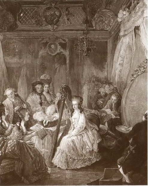 Мария Антуанетта играет на арфе в своих апартаментах в Версале. Портрет работы Ж. Б. А. Готье-Даготи. 1776 г.