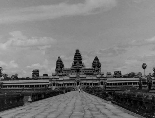 Если смотреть на запад с высокого променада между западным входом Анкгор-Вата и западной стороной Второй галереи, центральная башня святилища находится прямо впереди. Можно также видеть две из четырех угловых башен, но две другие скрыты за ними.