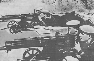 Будущие моряки осваивают стрельбу из пулемета «Максим» с помощью малокалиберного пулемета Блюма (укреплен сбоку станкового пулемета)