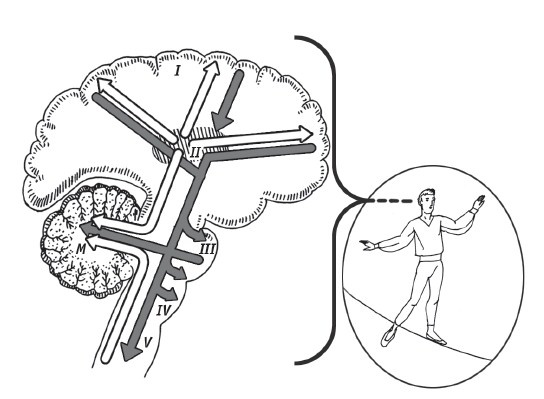 Рис. 1. Мозжечок (М) отвечает за координацию наших движений: I – кора больших полушарий; II – таламус; III – варолиев мост; IV – продолговатый мозг; V – спинной мозг
