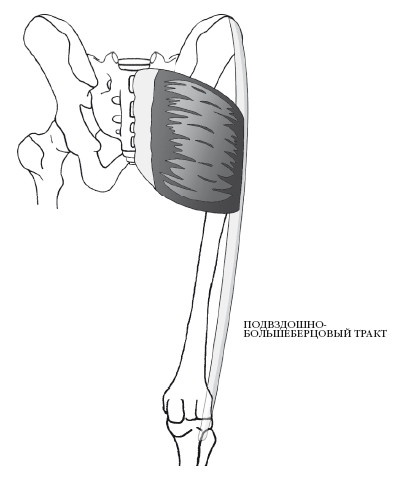 Сокращение этих мышц стабилизирует колено. Действуя совместно с малой и средней ягодичными мышцами (3), они могут производить движение в тазобедренном суставе благодаря натяжению подвздошно-большеберцового тракта (А). Также они могут оказывать воздействие на таз совместно с квадратной мышцей поясницы (4) и производить: