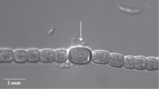 Рис. 23. Изображение гетероцисты. В некоторых образующих нити видах цианобактерий (см., например, рис. 17, а), когда клетки начинают восстанавливать (связывать) атмосферный газообразный азот (N2) до аммония (NH4), они образуют особую клетку – гетероцисту, в которой отсутствует реакционный центр, испускающий кислород (фотосистема II). Нитрогеназа – фермент, отвечающий за связывание азота, – обнаруживается исключительно в гетероцистах, где она защищена от повреждения кислородом. Это один из самых ранних примеров дифференциации клеток в биологии. (Публикуется с разрешения Арнольда Тэйтона и Джеймса Голдена.)