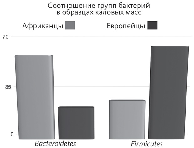 Согласно гарвардскому исследованию, в микрофлоре представителей западного общества доминируют бактерии группы Firmicutes, в то время как в микрофлоре жителей африканских стран преобладают бактерии группы Bacteroidetes. Взгляните на график.