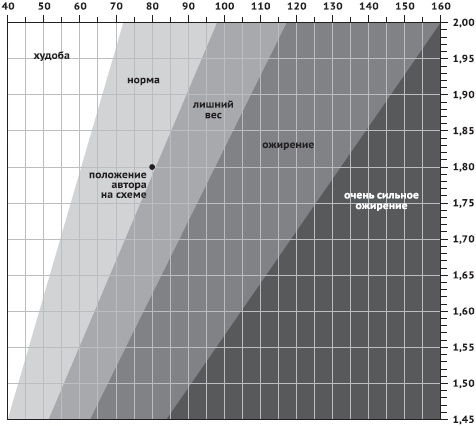 Диаграмма для определения степени ожирения: по горизонтали – вес в кг, по вертикали – рост в м. Черным кружком отмечено состояние автора.