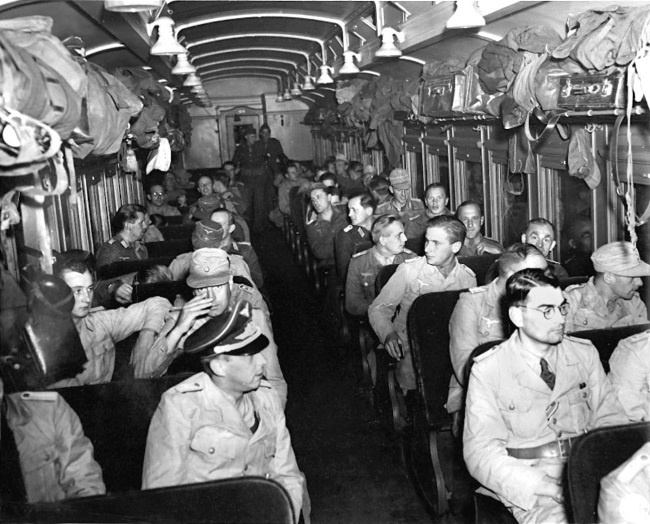 В порту Бостона (США) немецкие офицеры в вагоне поезда ожидают транспортировки в лагерь военнопленных