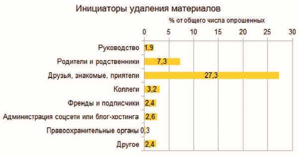 Очевидно, что в Сети так или иначе действует распределенная нормативная функция. 34,8 % всех опрошенных заявляют, что им случалось удалять контент по требованию других участников сетевой (или не сетевой) коммуникации. Инициировалось такое удаление разными источниками.