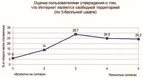 Далеко не все из тех, кто считает интернет свободной территорией, выступают также и за мягкость или отсутствие наказаний за различные противоправные действия в Сети. Несмотря на то что статистически существует тенденция к высказыванию подобных мнений в совокупности, по-видимому, зачастую мнение о свободе интернета оказывается лишь декларируемым лозунгом, ничем не подкрепленным.