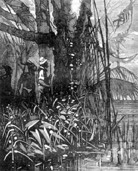 Вскоре он услышал позади себя могучее дыхание, похожее на вздохи кузнечных мехов. Он обернулся и, к великому изумлению, увидел, что оба негра, вооружившись полым тростником, изо всех сил надувают буйволиную шкуру.