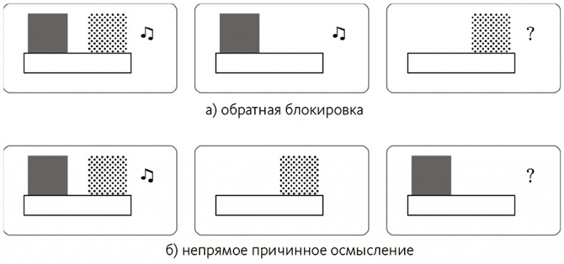 В исследовании снова использовалась шкатулка, звучащая, когда на нее ставят определенный кубик. Видя, что кубики А и В вместе заставляют машинку играть, а вслед за этим только кубик А вызывает звуки (см. рис. 2.2 (а)), дети гораздо реже утверждали, что кубик В также вынуждает механизм включаться.